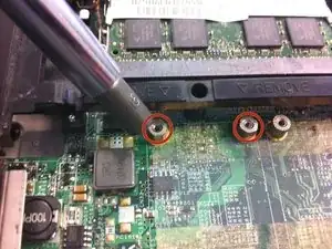 Удалите два (2) винта Phillips длиной 3,7 мм, крепящие беспроводную карту к материнской плате.