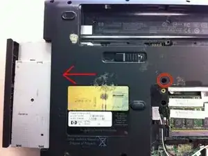 Удалите винт над крышкой доступа к оперативной памяти, который удерживает оптический привод на месте. Затем сдвиньте привод влево, чтобы вынуть его из корпуса. Будьте осторожны, чтобы не оторвать переднюю панель лотка.