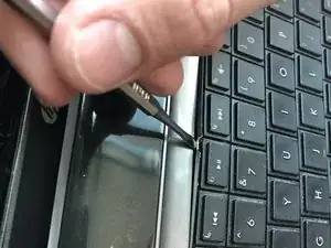 Используя металлический инструмент, нажмите центральную защёлку и подденьте клавиатуру, поворачивая инструмент в сторону экрана.