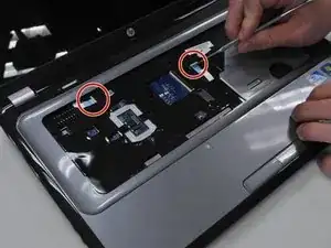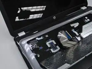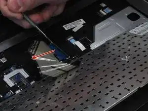 Отверните чёрную защёлку, удерживающую ленточный кабель клавиатуры, и выньте кабель.