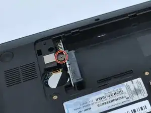 Снизу компьютера открутите винт крепления разъёма жёсткого диска и выньте штекер жёсткого диска.