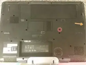 Сдвиньте защёлку батареи вправо, как показано на изображении, чтобы освободить батарею.