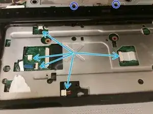 Удалите семь винтов M2.5x8, фиксирующих панель под ладонь. На эти винты указывают стрелки.