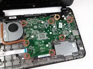 Выверните шесть винтов Phillips #1 длиной 5,5 мм, крепящих материнскую плату.