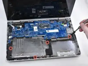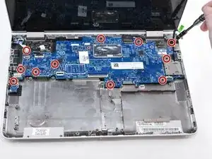Снимите одиннадцать винтов Phillips #1 длиной 4.6 мм вокруг материнской платы.