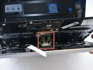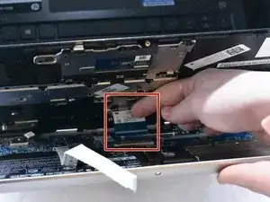 С помощью ногтя отсоедините разъём ZIF для кабеля тачпада, подняв небольшой фиксирующий язычок.
