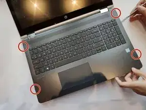 Используйте металлическую лопатку, чтобы ослабить четыре угла панели клавиатуры. Угол обведен красным, как показано на первом изображении.