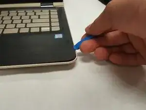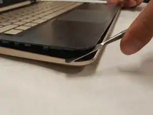 Используя пластиковый инструмент для вскрытия, подденьте клавиатуру в указанном месте и приподнимите её.