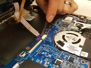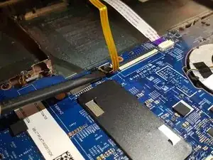 Используя лопатку, поднимите фиксаторы двух указанных шлейфов и аккуратно извлеките их из разъёмов.