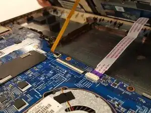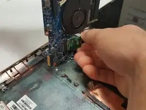 Аккуратно приподнимите всю материнскую плату, наклоняя её в левую сторону ноутбука.