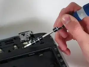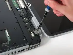 Отвинтите два шурупа Philips длиной 8 мм, крепящие петлю к дисплею ноутбука.
