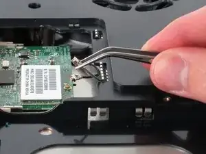 Используйте пинцет, чтобы отсоединить серый и черный кабели, подключенные к зеленой WiFi карте.