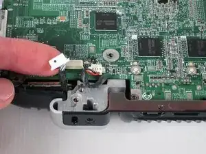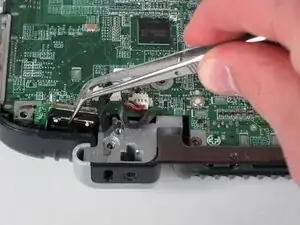 С помощью пинцета удалите кабель левого динамика, потянув белый разъем на себя.