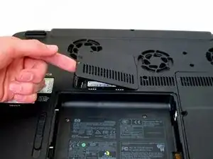 Потяните черную защелку с наклейкой услуги HP, чтобы отключить дисплей от материнской платы.