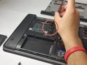 Удалите 2 крестообразных винта длиной 4 миллиметра, которые закрепляют разъём подключения батареи к корпусу ноутбука.