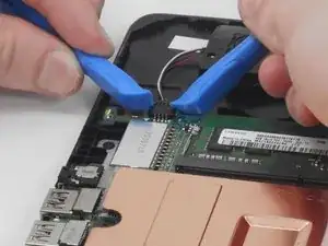 Используйте два пластиковых монтажных инструмента, чтобы аккуратно «пошагово» вынуть разъём динамика прямо из гнезда на материнской плате.