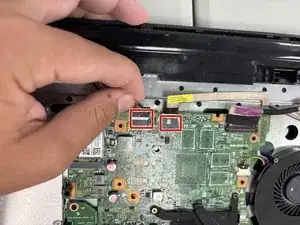 Отсоедините два коннектора на задней стороне материнской платы пальцами.