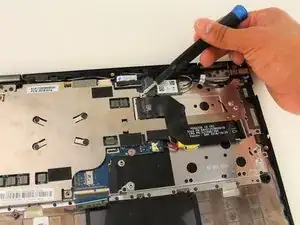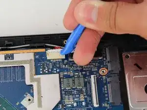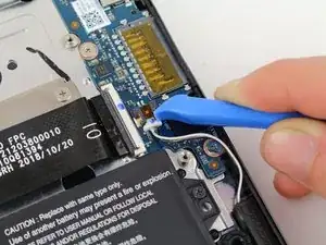 Отключите ленточный разъём с помощью инструмента для вскрытия, перевернув вверх черную защёлку и вытащив ленту.