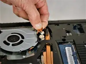 Отключите две шлейф‑ленты, находящиеся под областью вентилятора.