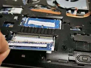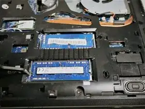 Освободите фиксирующие защёлки модулей оперативной памяти с обоих концов каждого модуля. После освобождения выдвиньте каждый модуль памяти.
