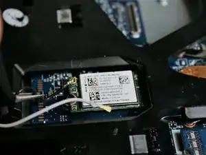 Пинцетом аккуратно снимите белый и чёрный провода с карты Wi‑Fi. Выведите провода из канала и отведите в сторону.