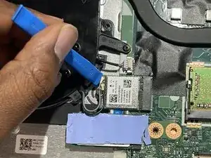 Отсоедините чёрный и белый антенные кабели от беспроводного модуля, используя инструмент для открывания.