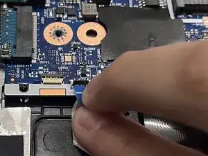 Используя ногти, отогните вверх фиксирующую планку на разъёме ZIF-кабеля, расположенном рядом с вентилятором и материнской платой.