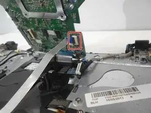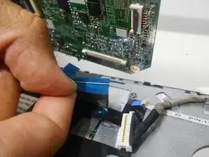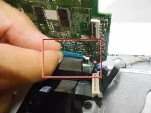 Аккуратно выньте второй (и последний) ленточный шлейф с материнской платы, потянув за синий язычок.