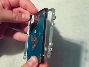 С помощью крестовой отвертки #0 отвинтите четыре винта 2,5 мм, по два с каждой стороны, чтобы освободить жёсткий диск от монтажного кронштейна. Эти винты находятся непосредственно рядом с ранее снятыми крепёжными винтами.