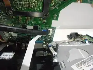 С помощью лопатки подденьте фиксатор разъёма для маленького ленточного кабеля рядом с местом, где находился вентилятор охлаждения.