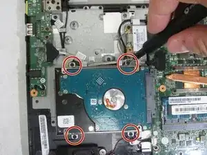 С помощью крестовой отвертки #0 отвинтите четыре винта 4 мм, фиксирующие кронштейн жёсткого диска к материнской плате.