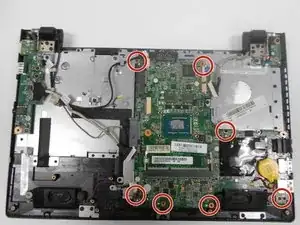 С помощью отвертки Phillips #0 выкрутите семь винтов длиной 3 мм, крепящих материнскую плату к корпусу.