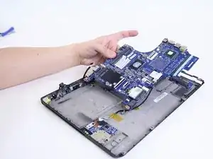 Поднимите материнскую плату из корпуса и отсоедините кабель на задней стороне материнской платы, подключённый к разъёму питания DC. Удалите материнскую плату из корпуса.