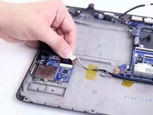 Отключите кабель, соединяющий VGA-разъём с материнской платой. Затем отключите кабель, соединяющий картридер с материнской платой.