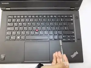 Вставьте острый конец лопатки сначала в паз с левой стороны и осторожно надавите вверх, пока рама вокруг клавиатуры не начнет подниматься. Повторите то же самое с другой стороны.