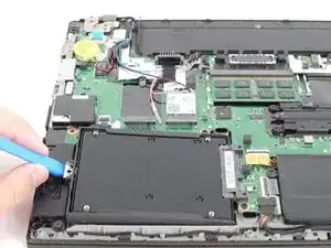 Вставьте пластиковое разъединяющее приспособление под аккумулятор CMOS и подденьте его, отводя в сторону от материнской платы.