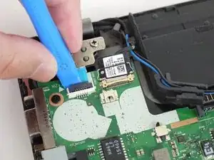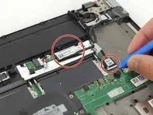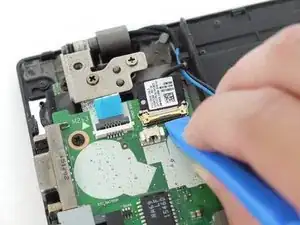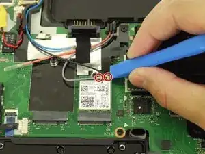 С помощью пластикового разъединяющего приспособления отключите два кабеля от карты Wi-Fi.