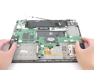 Перед тем как полностью извлечь материнскую плату из устройства, обязательно отключите разъём ZIF от материнской платы. Дополнительную информацию можно найти на третьем изображении в шаге 27.