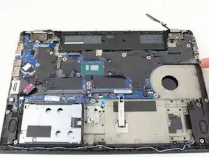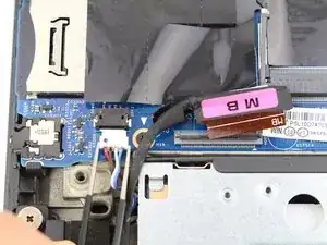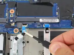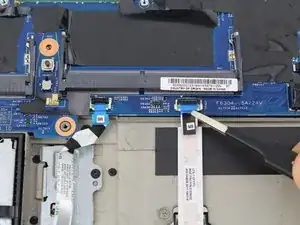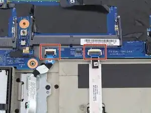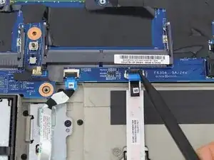 Поднимите два ZIF-кабеля для тачпада и датчика отпечатка с помощью заострённого конца пластиковой лопатки.