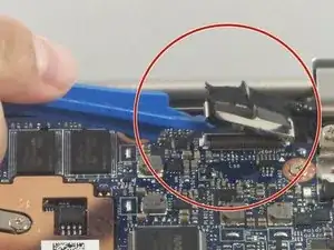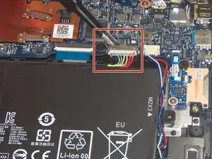 Пластиковой инструментом аккуратно подденьте и отсоедините кабель экрана от материнской платы.