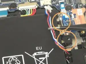 Пинцетом отсоедините чёрные и белые антенные кабели, подключённые к модулю Wi-Fi.