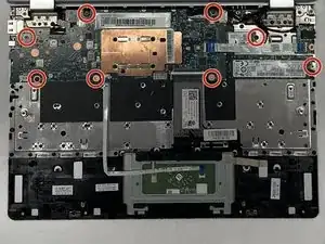 Используйте отвертку Phillips #000, чтобы удалить восемь винтов, крепящие материнскую плату, карту Wi-Fi и карту SSD.