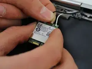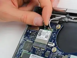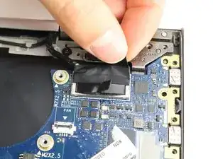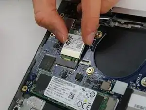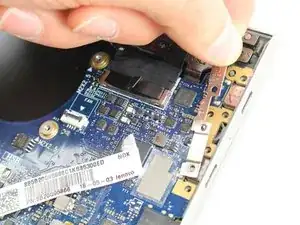 Снимите материнскую плату, удерживая её за нижнюю часть и оттянув по диагонали от ноутбука.