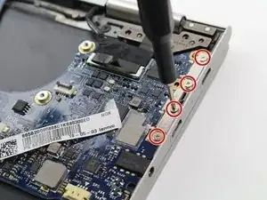 Используйте крестовую отвёртку Phillips #00, чтобы удалить пять винтов 3,5 мм, фиксирующих материнскую плату.