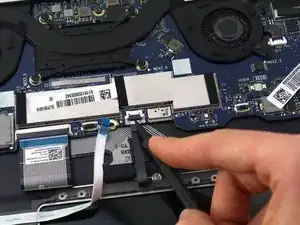 Используйте лопатку, чтобы отсоединить кабель датчика отпечатков, подогнув вверх серую защёлку разъёма. Вытяните кабель.
