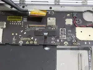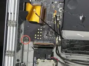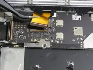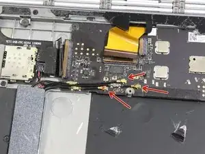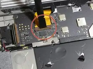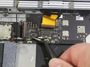 После открытия экрана отсоедините ленточный кабель, соединяющий нижний экран с материнской платой, аккуратно потянув кабель пинцетом.