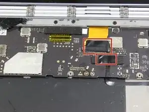 Отсоедините два кабеля с правой стороны материнской платы.
