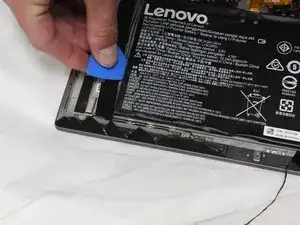 Используйте пластиковую лопатку, чтобы снять две чёрные полоски с каждой стороны батареи, чтобы освободить её от препятствий.