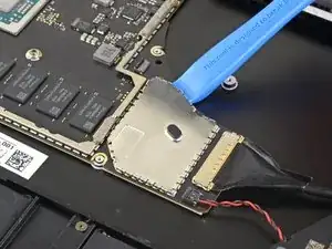 Используйте плоский конец лопатки, чтобы приподнять и вынуть первый кабель дисплея из его разъёма на материнской плате для отключения.