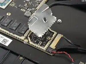 Используйте отвёртку Torx T3, чтобы выкрутить два винта длиной 3 мм, фиксирующие кронштейн материнской платы.